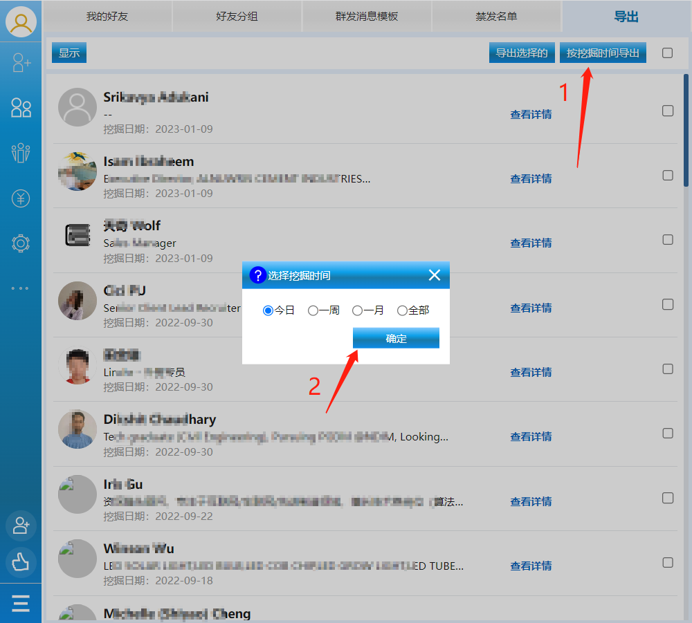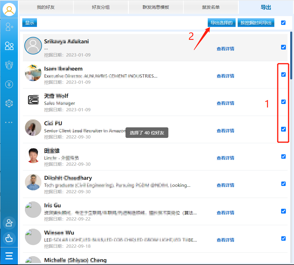 在“好友”导航栏的“导出”选项卡中,会显示已经挖掘的好友,选择要导出的好友,再点击“导出选择的”按钮。