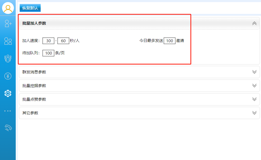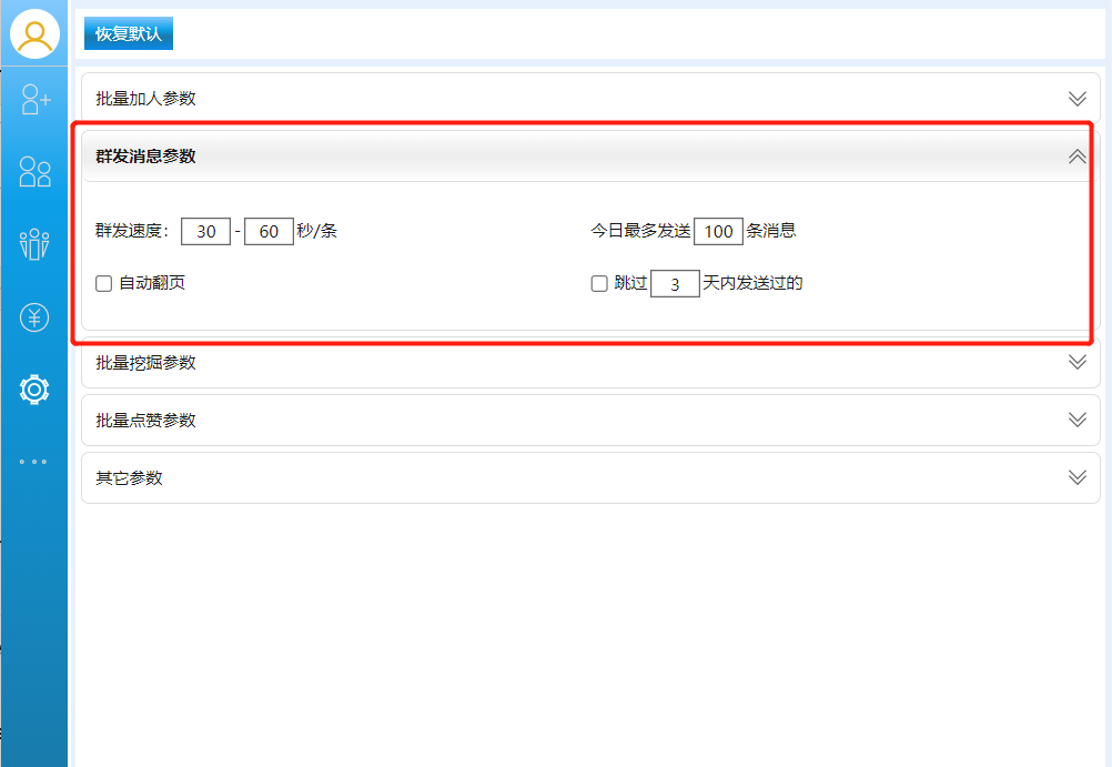在“设置”选项卡中可设置各个操作参数,主要分为:批量加好友参数、群发消息参数、批量挖掘参数、批量点赞参数、其它参数。