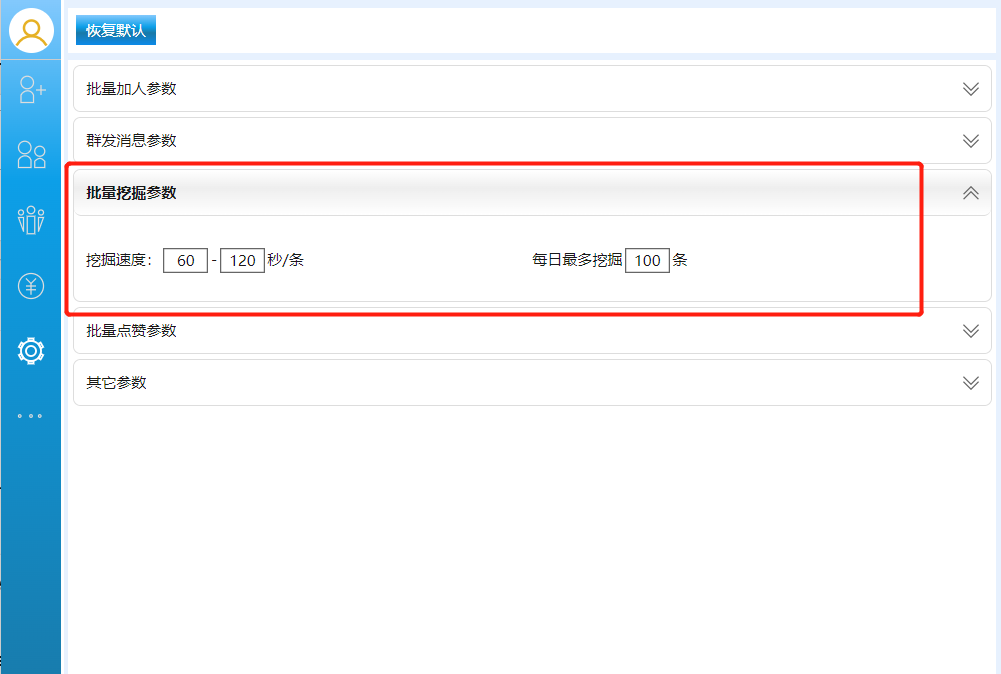 批量挖掘参数用来设置批量挖掘好友资料时的各个参数。