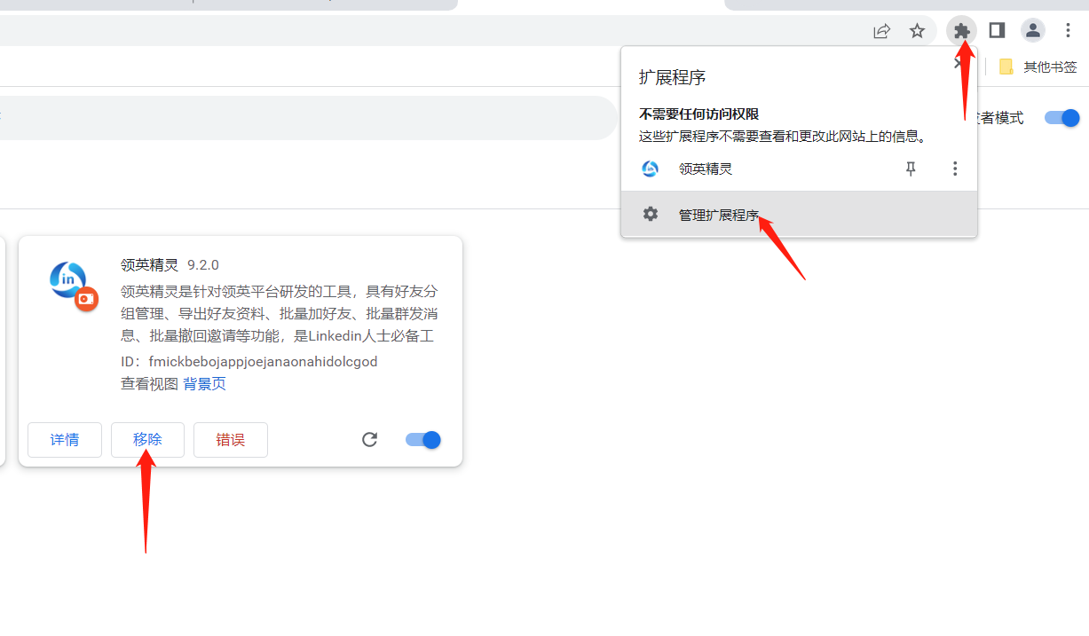Linkedin平台会经常更新,领英精灵为了适用新版领英,所以会跟随领英更新,平时小的更新只需要重启浏览器即可,如果遇到大的更新就要卸载旧版本,下载新版本的重新安装使用,下面是领英精灵的升级操作教程。升级分为2步,第一步:移除旧版本的领英精灵,第二步:下载新版领英精灵安装。