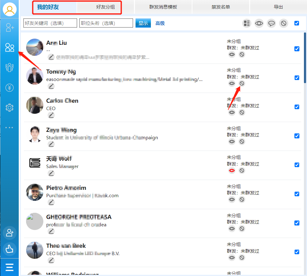 领英精灵提供2种方式将好友添加到禁发名单,分别是:单个添加、批量添加