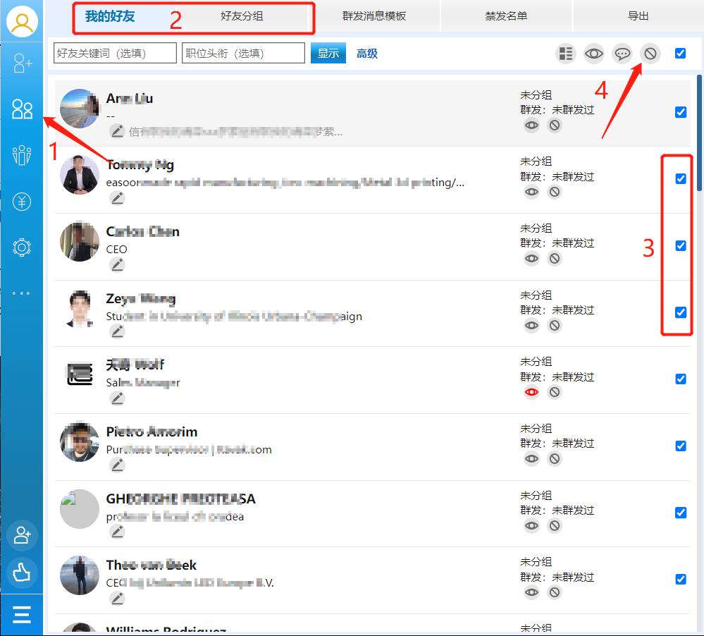 在群发消息时,有些好友是不想发消息给他的,这时可以将这个好友加到禁发名单中,这样,以后群发的时候就会跳过,不再发消息给他。