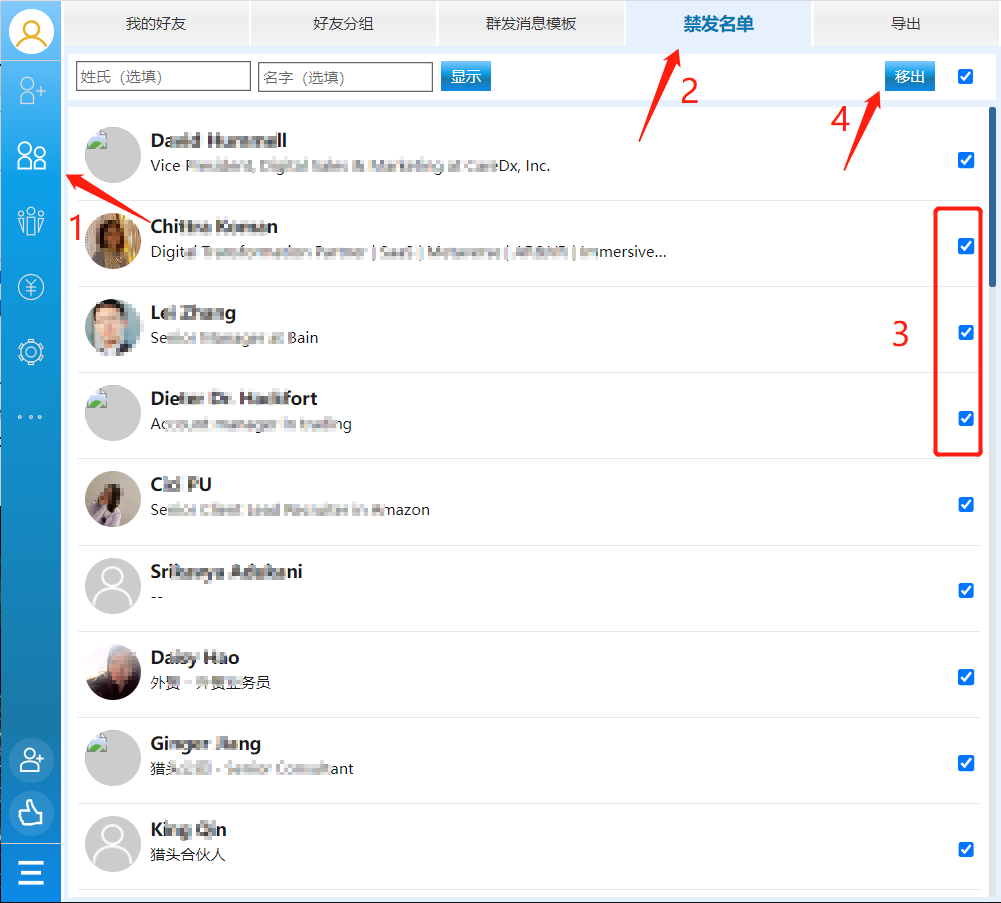 如果要移出禁发名单,只需在“禁发名单”选项卡中选择该好友,然后点击“移出禁发名单”图标。