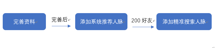 总结拓展人脉的过程,第一阶段完善资料,为第二阶段做铺垫;然后再通过第二阶段添加系统推荐的人脉构建初始人脉圈,当初始人脉构建成功后,再通过关键词搜索精准添加目标人脉。