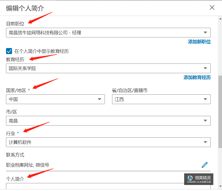 这一步是为第二阶段做准备的,资料越详细,加好友时的通过率就会越高。特别是教育经历和工作经历及行业,Linkedin会根据这些信息推荐相关人脉。