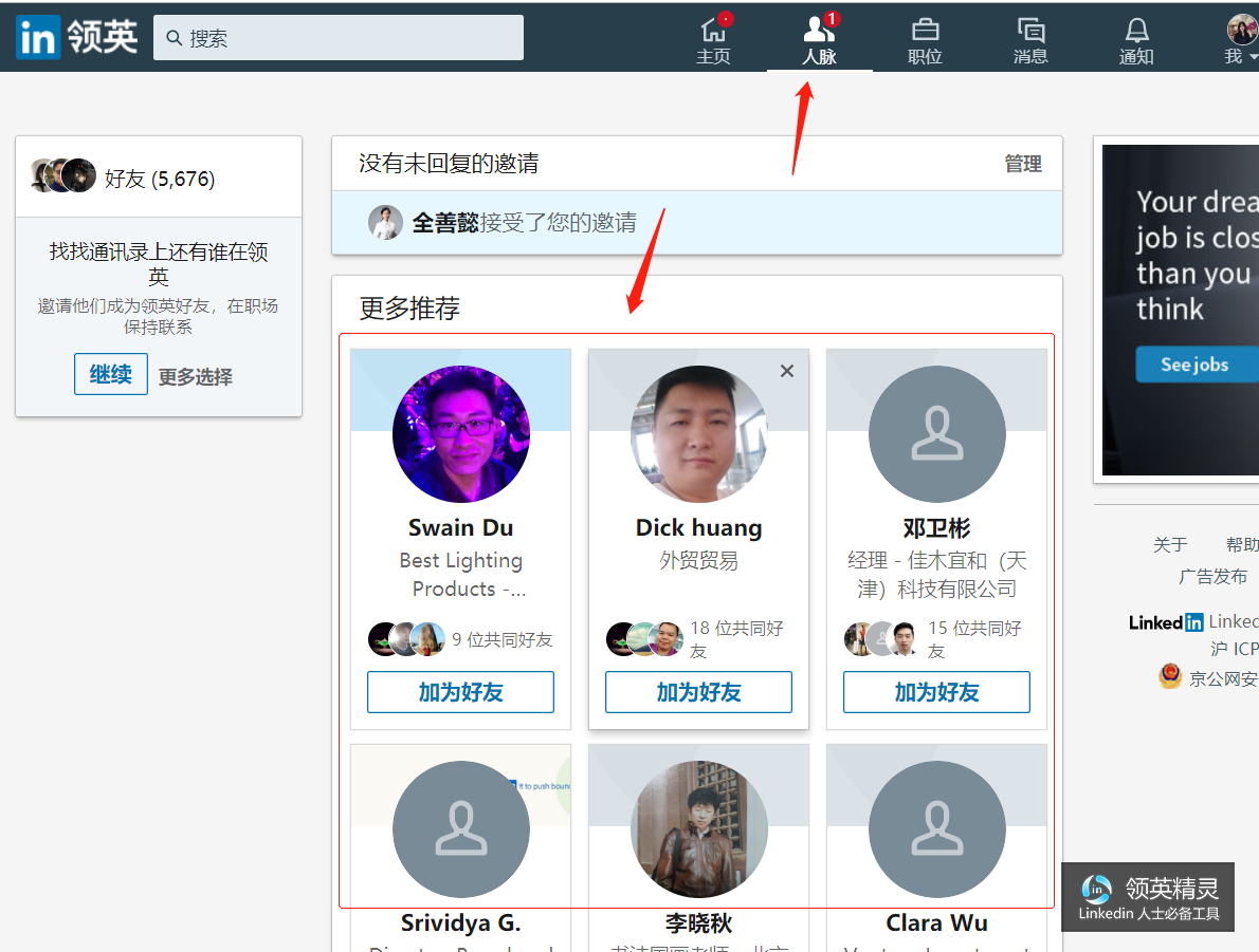 这时应该充分利用好Linkedin系统推荐的人脉,Linkedin会根据你的教育经历、工作经历、行业等信息推荐相似的人脉,这些人是可以添加的,而且通过率会很高。通过系统推荐人脉构建自己的初始人脉圈。