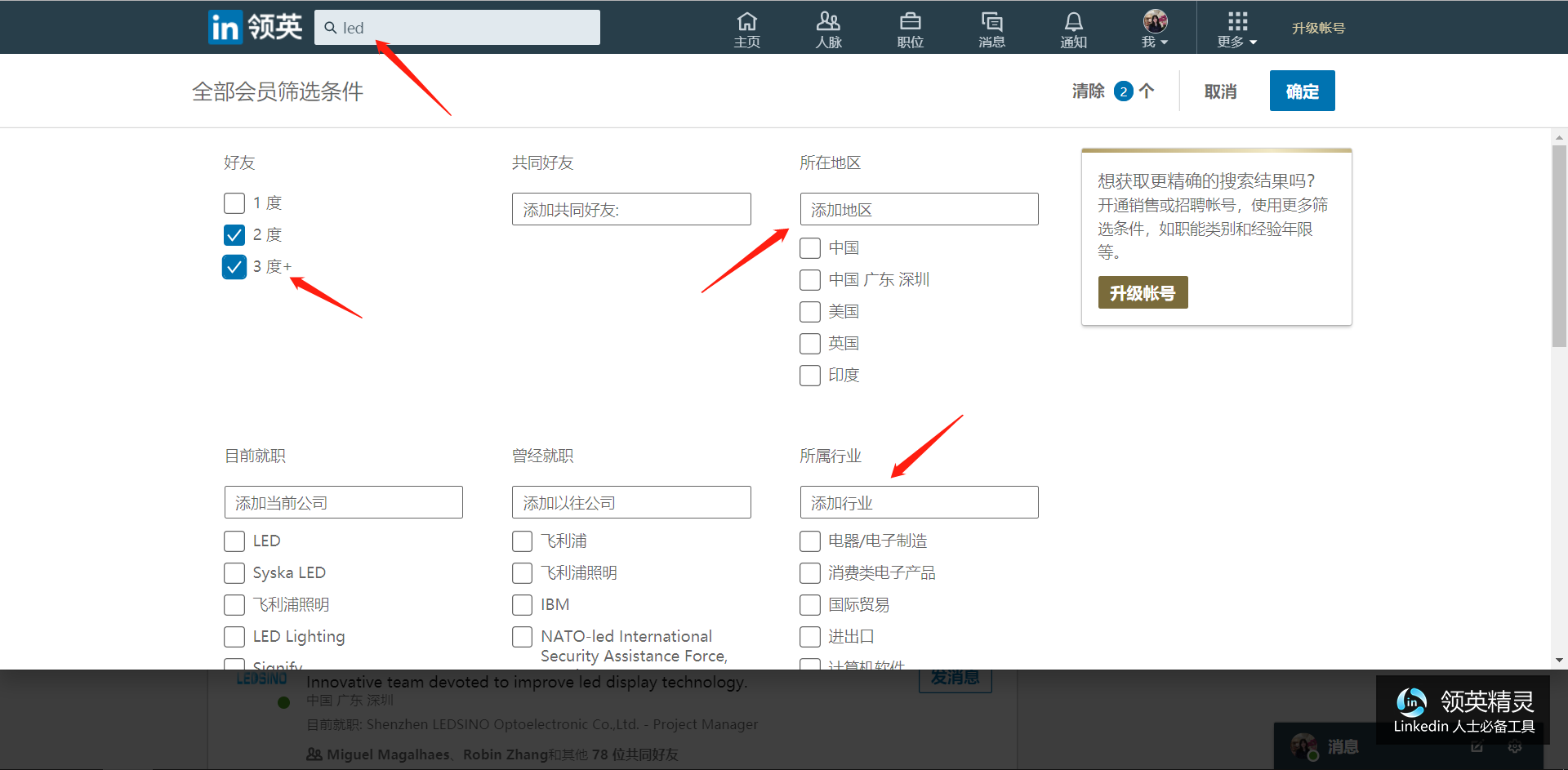 这里一定要选择2度或3度人脉,设置的条件越精准,搜索到人脉也就越精准。