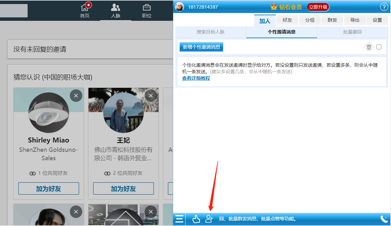 同样这步也可以借助领英精灵批量添加,可大大提高添加效率。